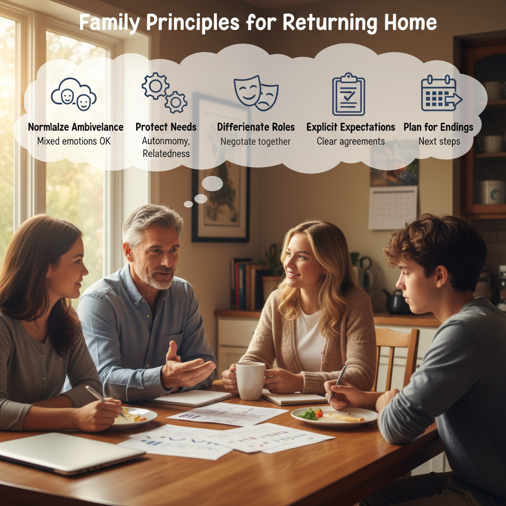 - Normalize ambivalence. Returning home triggers mixed emotions for everyone. Normalizing reduces shame and defensiveness and opens the door to negotiation rather than blame.